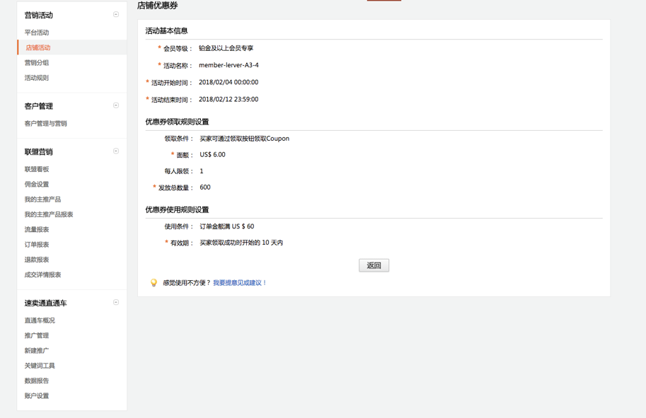 Step3:创建完成。如果需要参加平台活动,必须根据平台活动要求先设置四个会员专享店铺优惠券活动: