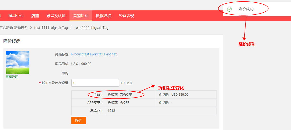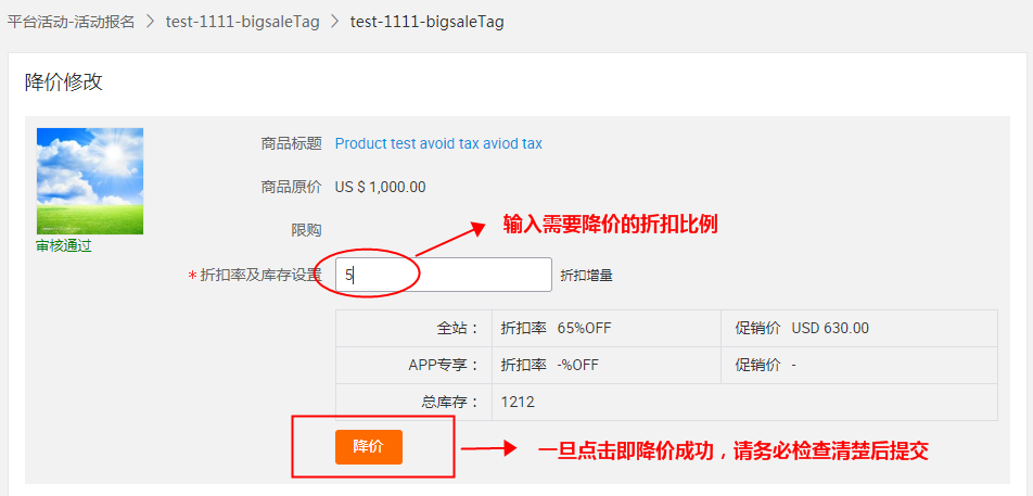 Step2:点击“降低促销价”,输入您想要降价的折扣比例后,点击“降价”: