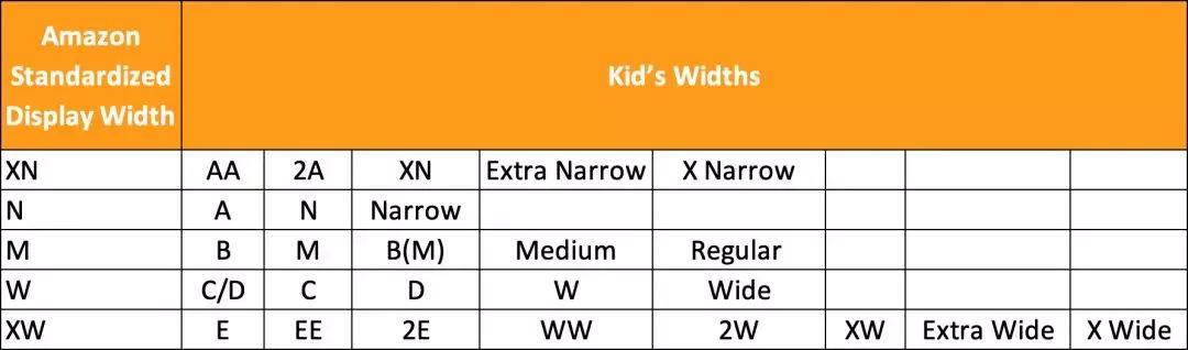 亚马逊不再使用字母数字宽度标示,而是利用其自有通用鞋宽范围 - 从 XXN 到 XXW - 具有便于最终买家理解的可懂值。上表显示了亚马逊批准的鞋宽范围,对应于业内使用的最常见鞋宽。