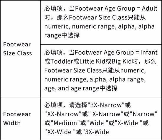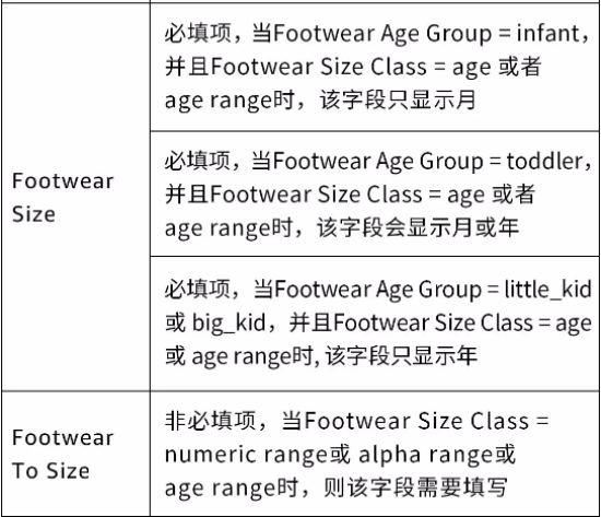 新鞋码属性(footwear_size attribute)包含9个新增字段,分别是:Target Gender; Age Range Description; Footwear Size System; Footwear Size Age Group; Footwear Gender; Footwear Size Class; Footwear Width; Footwear Size, Footwear To Size.