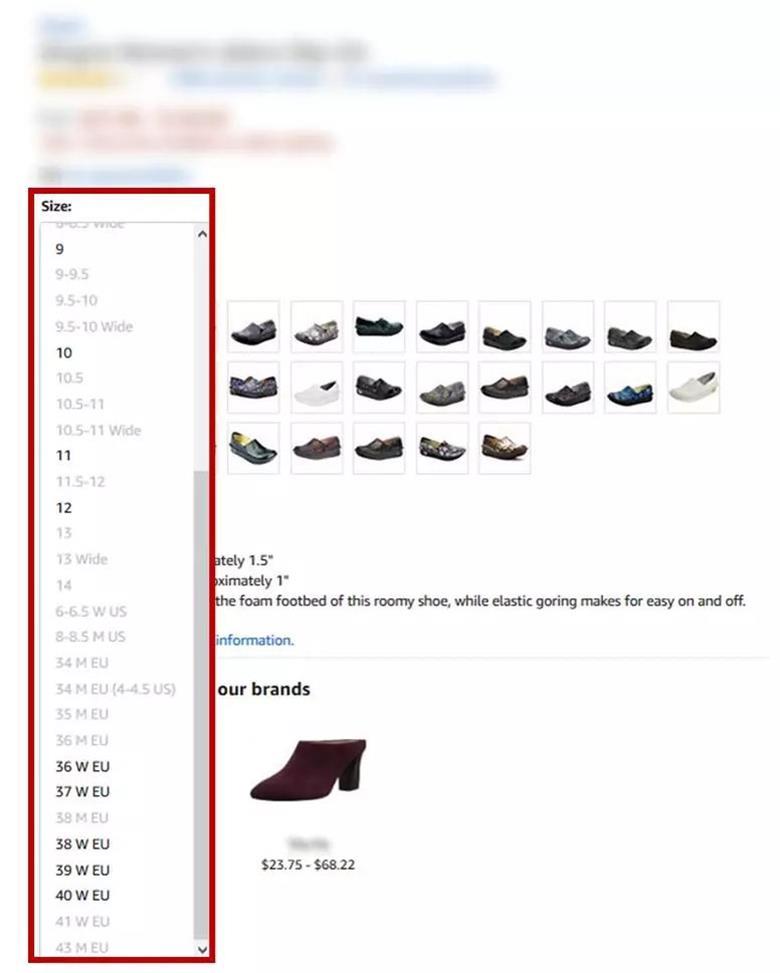 为了保证良好的购物体验,亚马逊标准化了鞋子尺寸属性值,要求每一个尺码菜单都遵循同一种连贯一致的尺码表现形式,方便消费者通过尺码和宽度进行搜索。同时,标准的尺码展示也有利于提高ASIN的浏览量,助力鞋靴类卖家提升销售转化。