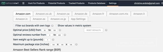 首先打开AmazeOwl并检查设置,将价格范围更改为卖家的目标价位,并将检查的个数范围更改为0到500,并设置重量和包装尺寸,所有其他设置保持不变,然后点击“hunt for products”和“hunt best sellers”: