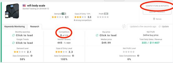 之后便会看到有多少个竞争对手,卖家可以点击“competitors and reports”来过滤掉不相关的竞争对手: