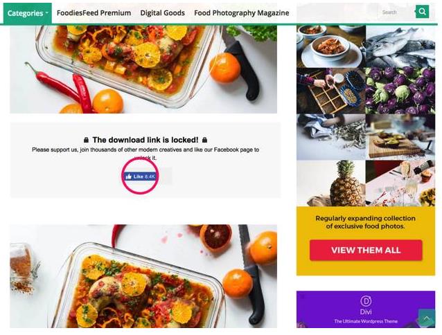 3、在FoodiesFeed 网站有些相片素材的下载区块是被锁住的(如下图),点击 Facebook按赞按钮,分享至用户的社群后就能解除锁定,显示下载链,这也是使用者能给FoodiesFeed付费以外的支持鼓励。