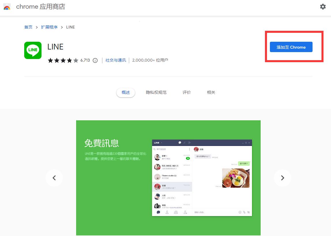 如果你不想下载Line客户端,那么你可以使用网页版。需要使用Google Chrome浏览器,然后安装Chrome插件。点击这里进入Chrome网上应用店的Line插件安装界面,或者直接进入Chrome网上应用店,然后搜索”Line’插件进行安装,后点击右侧”添加至Chrome“即可。