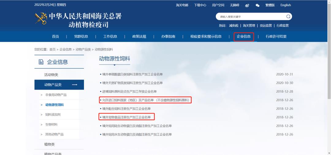 海关总署动植物检疫司网站 → 企业信息 → 动物产品 → 动物源性饲料 → 查询相关国家及企业信息
