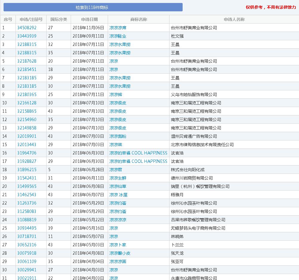 “凉凉”这个词随着《三生三世十里桃花》的热播也受到了全名追捧,对于这个词,赛贝小编检索到118件相关的商标,有单独申请注册“凉凉”的,也有注册“凉凉水果捞”“凉凉凉面”等与“凉凉”相关的行业的商标,其中35类、29类等都是热门注册类别。