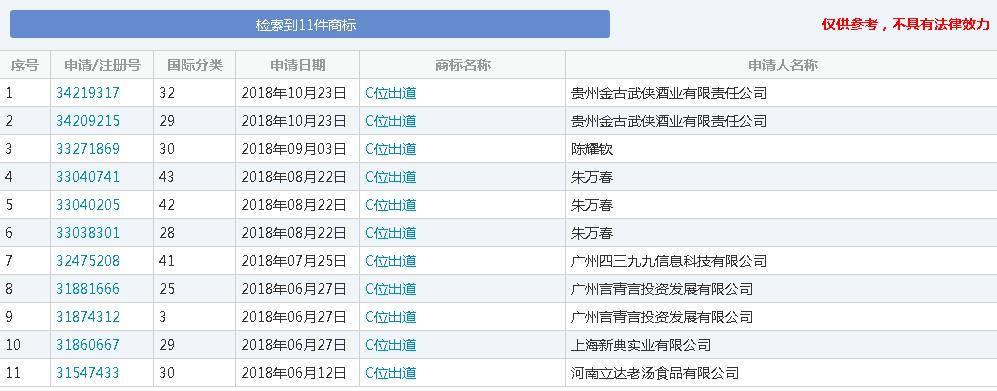 关于“C位出道”这个词,可能由于相关的行业不是很明显,赛贝小编检索到11个结果,主要是酒业企业和食品企业居多,关注较多的商标类别为29类和30类。