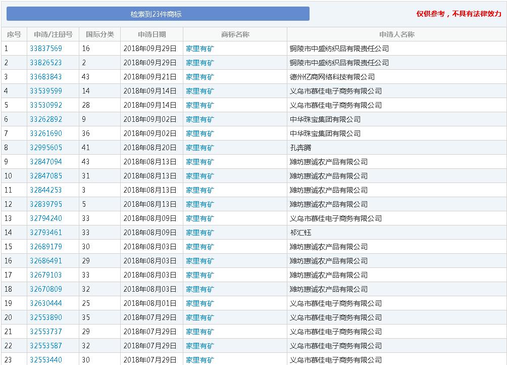 关于该词的商标申请,已有23条申请记录,申请该商标注册的企业类型大多为纺织品公司、电子商务公司以及农产品公司,其中33类和29类商标比较受欢迎。