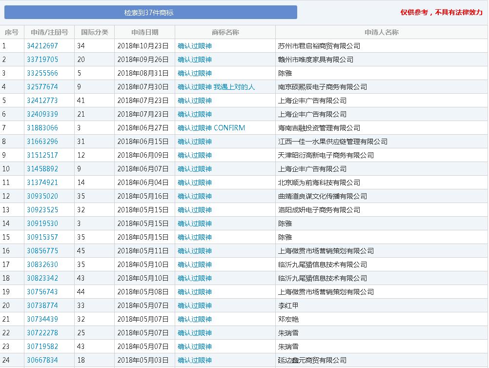 近日,新浪微博发布2018年度热词,“确认过眼神”“skr”等热词上榜,根据往年的数据,网络热词一向受商家们追捧,喜欢把它们注册商标,因为这次词汇本身就具有高热度和高传播量,能够快速获得市场关注,不需要商家们投入太多的市场宣传费用。那么对于2018新鲜出炉的这些热词又是怎么样呢?赛贝小编去查了下,果然热词TOP5都被申请注册商标了,而且申请注册的人还不少,一起来看看吧。